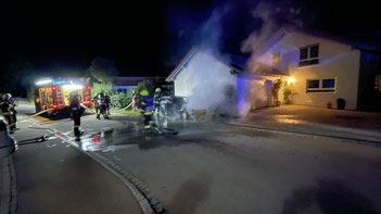 In der Nacht zum 09.08.2025 wurden die Feuerwehren Ermengerst, Wiggensbach und Kempten-Hohenrad zu einem Brand mit dem Stichwort „B3 – PKW brennt an Garage“ alarmiert.